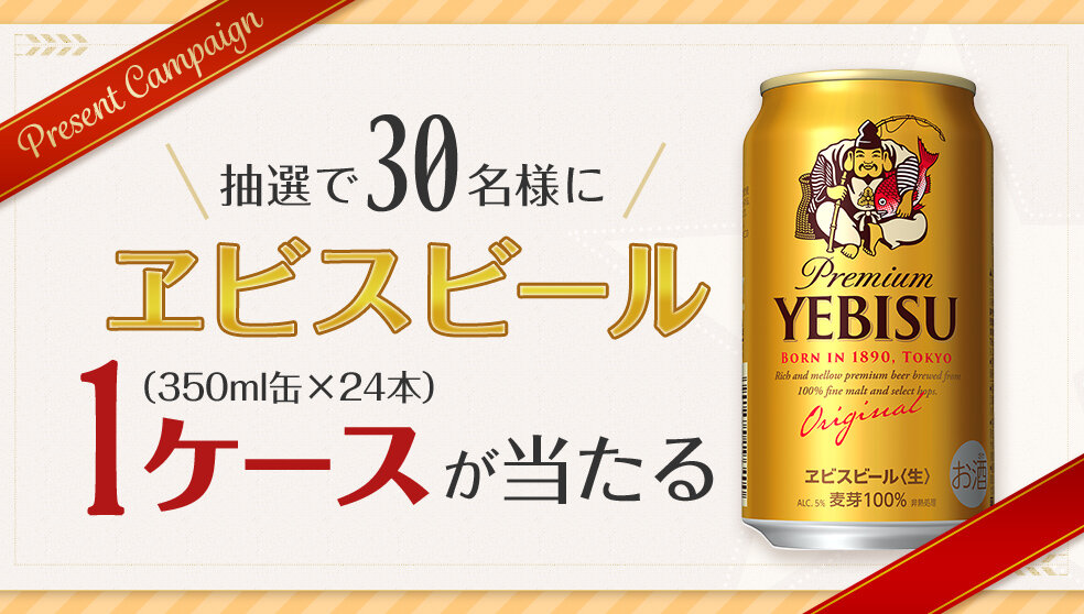- ご応募いただいた方の中から抽選で30名様に、ヱビスビール1ケース(350ml缶×24本)をプレゼントいたします。