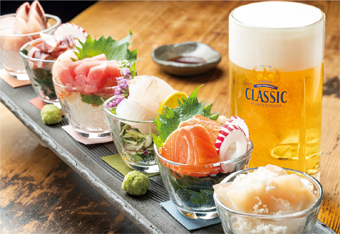 ガラスの器に旬の魚介のお造りを7~9種類盛った、見た目も美しい一品。大きな市場がある旭川には全道から新鮮な海の幸が集まる。定番のタコ頭の山ワサビかけ以外は、目利きの店主の仕入れにより内容が変わるそう。今回はホタテ、ヒラメ、ブリ、本マグロ、ホッキ、甘エビがラインアップ。