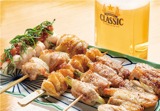 炭火で香ばしく焼き上げたジューシーな串焼きが、この店のイチオシだ。道産素材にこだわり、肉のさばき方も一工夫している。一番人気のもも串をはじめ、その日のお薦めが並ぶ盛り合わせは、ビール好きにはたまらない一皿。今回は梅しそササミ、ぽんぽち、ぶた、アスパラ巻がラインアップ。