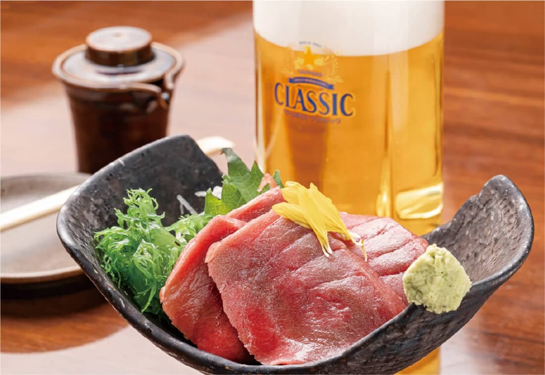 ここのイチオシは、なんといっても氷温熟成させた本マグロだ。密閉した袋に入れたマグロを氷水に漬けて、毎日ドリップを取り除きながら寝かせること3日以上。不要な水分が抜けて旨味だけが残ったマグロは、ねっとりとした濃厚な食感だ。ぜひ刺身で、マグロ本来のおいしさを味わってほしい。