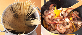 鍋に湯を沸かし、塩適量を入れてリングィーネをゆで始める。大きめのフライパン(または鍋)にオリーブオイルを中火で熱し、にんにくを炒める。香りが出たら玉ねぎ、エリンギ、えび、ホタテ、パプリカを加えて炒め合わせる。