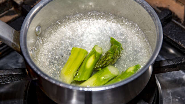 鍋に湯を沸かして塩少々を入れ、アスパラガスを加えてすぐに火を止める。そのまま1分〜1分30秒くらいおいて余熱で火を通す。