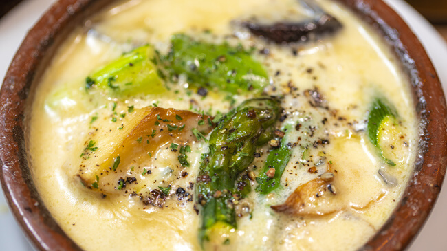 ブルーチーズソースを作る。鍋に生クリームを入れ中火にかけ、塩、顆粒スープの素を加える。煮たったらブルーチーズを入れて混ぜ、すぐに火を止めて余熱で溶かす。2のアスパラガスの湯をしっかりきって、オーブンに入れていた器に加え、さらに1分ほど焼く。