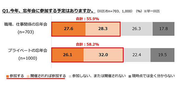 ■今年の忘年会、「職場」55.9%、「プライベート」58.2%と半数以上が参加の意向
