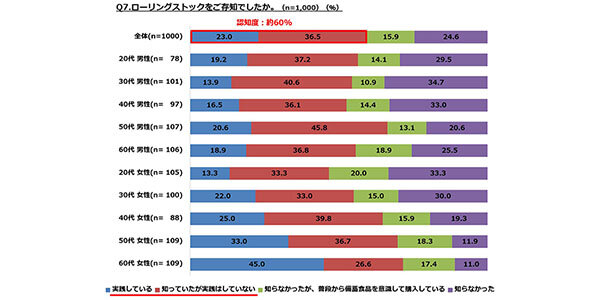 全員に対し、ローリングストックを知っているか聞いたところ、全体では「実践している」(23.0%)+「知っていたが実践はしていない」(36.5%)と認知率は59.5%だった。性年代別の認知率は、「50代男性」(66.4%)、「40代女性」(64.8%)、「50代女性」(69.7%)、「60代女性」(71.6%)が6割を超え高かった。また、実践者は「50代女性」(33.0%)と「60代女性」(45.0%)が3割を超え高かった。