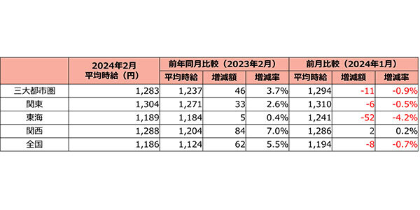 三大都市圏の平均時給は、1,283円(同+46円/3.7%)。うち、関東は1,304円(同+33円/2.6%)、東海は1,189円(同+5円/0.4%)、関西は1,288円(同+84円/7.0%)であった。