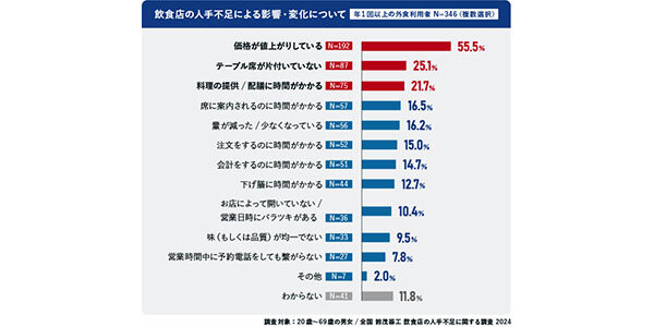 飲食店の人手不足による影響・変化については、「価格が値上がりしている」(55.5%)、「テーブル等が片付いていない」(25.1%)、「料理の提供/配膳に時間が掛かる」(21.7%)がトップ3となり、消費者が影響・変化を目に見えて体感できるところまで来ていることが分かった。