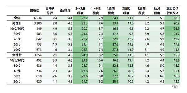 JRCでは、2024年現在の人口構成比モデルに沿うように抽出したアンケート対象者に対して、1ヶ月間休暇が取得できる場合、国内旅行・海外旅行の限定はせずに、何日間旅行に行きたいかを聴取した。全体としては、旅行希望者に関してはどの世代も「1週間程度」(24.1%)と「2~3泊程度」(23.2%)の2つに概ね集中する傾向があった。また、「2週間程度」については11.1%で、「旅行には行かない」は18.0%だった。