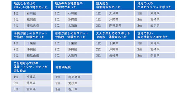 1位の沖縄県は、宿泊施設などの従業員の対応、マリンアクティビティや体験施設でのサービス、お祭り、タクシーの運転手や居酒屋の店員の対応の良さ、また、道行く人が親切といった声が多い。2位の宮崎県、3位の岩手県も同様に宿や居酒屋の対応を挙げる人が多いが、方言が心地よいという声も。宿や飲食店などのホスピタリティの高さ以外にも地元の人の優しさや飾らない雰囲気が印象に残る