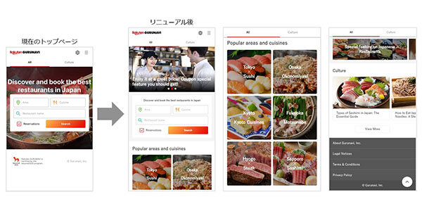 なお、「トップページの刷新」では、エリアや業態検索に加え、新設した「特集ページ」へのリンクを目立たせたほか、「訪日外国人に人気のエリア×業態」や「外国人ユーザーに人気の記事」へのリンクを追加するなど、ユーザーのニーズに応じたコンテンツを配置し、店舗ページへの導線を強化した。また、「特集ページの新設」では、より細かなニーズに応じて店舗ページへ誘導できるよう、外国人ユーザーのニーズが高いテーマを切り口とした特集ページを新設。特集ページ一覧を用意することでサイト内の回遊性を高めた。