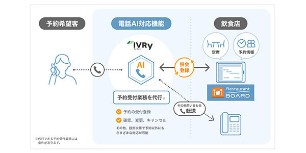 リクルートが運営する、予約管理・台帳アプリ「レストランボード」は、㈱ IVRy( アイブリー ) の対話型音声 AI SaaS 「 IVRy 」と連携し、「電話 AI 対応機能」の提供を 10 月 8 日より開始した。本機能は予約希望客からの電話に 24 時間いつでも応答するため、飲食店は予約の電話を取りこぼさず、来店客の接客や店内業務に集中でき、予約希望客にとっても、お店に電話がつながらない煩わしさがなくなる。