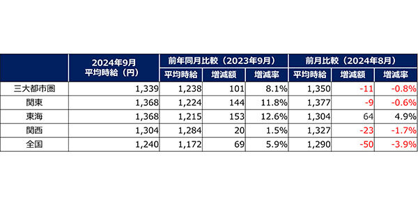 また、三大都市圏の平均時給は、 1,339 円 ( 同 +101 円 /8.1 % ) 。うち、関東は 1,368 円 ( 同 +144 円 /11.8 % ) 、東海は 1,368 円 ( 同 +153 円 /12.6 % ) 、関西は 1,304 円 ( 同 +20 円 /1.5 % ) であった。
