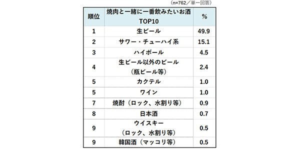■「焼肉」と一緒に飲むのは生ビール!半数が支持、脂をさっぱりさせる炭酸系が上位にランクイン