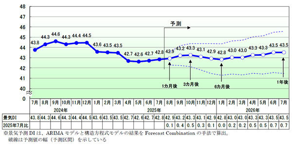 帝国データバンクは、全国 26,196 社を対象とした 2025 年 7 月の国内景気動向を調査・集計し、景気 DI ※ として発表した。 7 月の景気 DI は、前月比 0.1 ポイント増の 42.8 となり、小幅ながら 2 ヶ月連続で改善した。国内景気は、個人消費には依然弱さが残るものの、自動車を中心とした製造業の生産回復がけん引し、わずかだが上向き傾向が続いた。