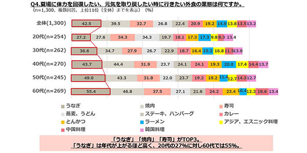 夏場に体力を回復したい、元気を取り戻したい時に行きたい外食の業態は何か聞いたところ、「うなぎ」(42.5%)、「焼肉」(39.5%)、「寿司」(32.7%)、「蕎麦、うどん」(26.8%)、「ステーキ、ハンバーグ」(22.4%)、「カレー」(20.9%)、「とんかつ」(19.2%)、「ラーメン」(14.9%)、「アジア、エスニック料理」(13.8%)、「中国料理」(13.5%)、「韓国料理」(13.2%)の順であった。「うなぎ」に注目すると、年代が上がるほど高く、20代の27.2%に対し60代では過半数の55.4%とほぼ倍近くの差があった。