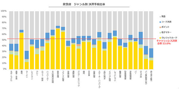 ジャンル別にみると、28ジャンル中20ジャンルでキャッシュレス比率が50%を超える。また、コード決済比率が高い「サラダ店」では、その比率が21.7%を占める。