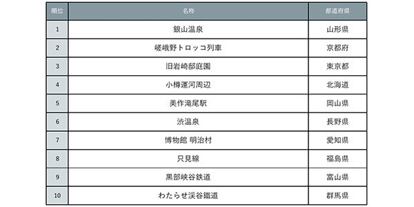 その世界観に包み込まれるような“没入感たっぷり”なレトロ紅葉スポット 1 位に輝いたのは、山形県の「銀山温泉」。銀山温泉の紅葉は、歴史ある木造旅館と色づく山々が織りなす風景が魅力。赤や黄に染まった木々が温泉街を包み込み、ノスタルジックな雰囲気を演出する。特に銀山川沿いの大正・昭和期の旅館が並ぶレトロな街並みと紅葉のコントラストは見事で、夕暮れ時にはガス灯がともり、神秘的な空気に包まれる。 2 位には京都府「嵯峨野トロッコ列車」がランクイン。嵯峨野トロッコ列車では、保津川渓谷を走る列車から紅葉の渓谷美を堪能できる。木製の座席や裸電球がともるレトロ感漂う車両でゆったりと進み、車窓からは赤や黄に染まる山々が広がり、秋の風景をじっくり楽しめる。夜には沿線がライトアップされる「光の幻想列車」が運行され、昼間とは異なるロマンティックな景色が見られる。続く 3 位の東京都「旧岩崎邸庭園」では、洋館前にある樹齢 400 年ともいわれる大イチョウが黄金色に染まり、クラシカルな洋館と調和して、異国情緒漂う秋の絵画のような風景が広がる。黄葉・紅葉の見頃は 11 月下旬~ 12 月上旬で、芝庭ではイロハモミジの紅葉とイチョウの黄葉の美しいコントラストが楽しめる。