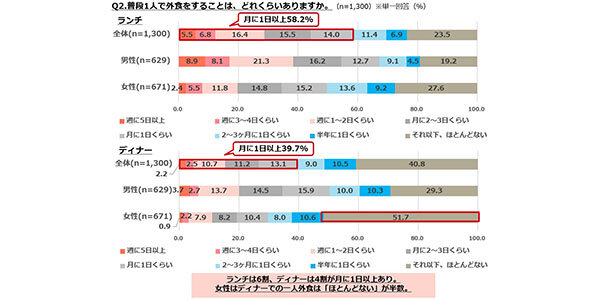 普段、1人で外食をすることは、どれくらいあるか聞いたところ、ランチは、全体では6割弱が「月に1日以上(週に5日以上5.5%+週に3~4日くらい6.8%+週に1~2日くらい16.4%+月に2~3日くらい15.5%+月に1日くらい14.0%)」(計58.2%)1人で外食すると回答。男女別で「月に1日以上」1人で外食すると回答したのは、「男性」(計67.2%)が7割弱だったのに対し、「女性」(計49.7%)は5割弱であった。