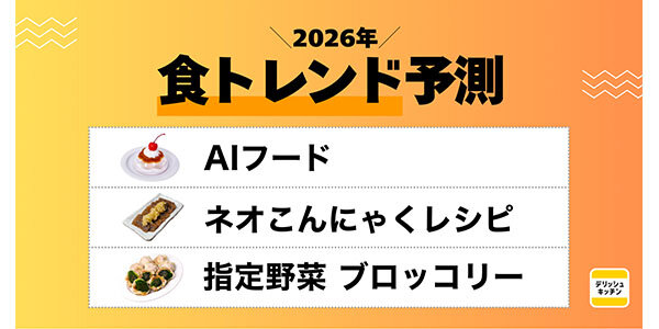 「 2026 年 食トレンド予測」として、「 AI フード」「ネオこんにゃくレシピ」「指定野菜 ブロッコリー」の 3 つを選出。