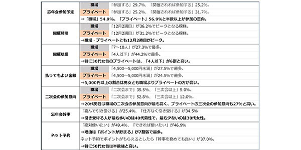 忘年会の規模に関しては、職場・仕事関係は「7~10人」(27.3%)と「11~20人」(27.1%)がほぼ同数で、次いで「5~6人」「21~30人」(各15.1%)が同数で続いた。一方、プライベートは「4人以下」(44.2%)が最も多く、「5~6人」(34.5%)、「7~10人」(20.2%)が続いた。性年代別では、「30代女性」の「4人以下」(59.6%)が突出して高かった。