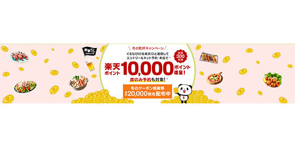ぐるなびは、「楽天ポイント」で外食をよりお得に楽しめる飲食店情報サイト「楽天ぐるなび」において、新年会をお得に楽しめる「 2026 冬の乾杯キャンペーン」を 1 月 5 日~ 2 月 28 日の期間で開催する。