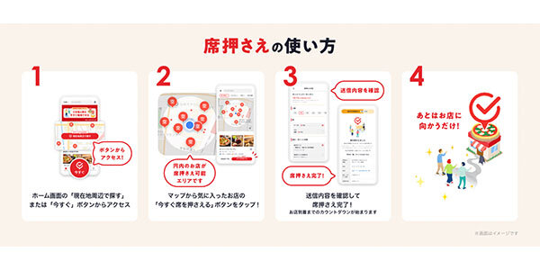 リクルートが運営する飲食店予約・グルメ情報サイト「ホットペッパーグルメ」は、「ホットペッパーグルメ」アプリで“いますぐ入れる近くのお店”を確認し、その場で席を確保できる「席押さえ」機能の提供を 1 月 22 日より全国で開始した。