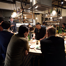 「立呑み コマル③」(東京・三軒茶屋)は、2018年11月にオープンしたスタンド酒場の新顔だ。円形のカウンターを配した10坪の空間は、スタンディングで最大20人を収容。連日満席の繁盛ぶりで、客単価2800円で月商480万円を売り上げている。「外食感度が高い30代~40代の男女が日常使いできる店」をイメージして開発したという同店は、食材の組合せや調理法の工夫に知恵を絞り、また仕込みも手間暇をかけたフードメニューが集客のフックだ。たとえば、ポテトサラダはコンビーフを練り込んで、仕上げにお客の目の前でホースラディッシュをすりおろす。鶏レバーの串焼きは、ニラの醤油漬けをトッピングして中華のエッセンスも感じさせるユニークな仕立てにし、ちくわの磯部揚げはちくわの中にゴルゴンゾーラチーズを詰めて調理する、といった具合。2019年4月に「新名物」として導入したシュウマイも、黒豚を使って店で仕込む本格派だ。また、刺身には長崎産の本マグロを使うなど、素材の品質で勝負する一品も用意。フードメニューは約40品を用意するが、原価率に45%を投じ、メニューの8割を300~600円のお値打ち価格で提供している。