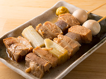 大衆酒場の定番である煮込みを、訴求力の高い看板メニューに仕立てて人気を呼んでいるのが、2017年8月にオープンした「酒場 角のうぐいす」(福岡・春吉)だ。同店の煮込みは具材を串打ちして大鍋で煮る「串煮込み」のスタイルで、牛すじ煮込みと豚の角煮をアレンジした「牛すじどろ炊き」と「角の豚串」の2種類を用意。とりわけ角の豚串は、豚の角煮、長ネギ、コンニャク、ウズラの卵が1串で楽しめるユニークなメニューだが、そうした個性的な商品設計に加え、入口正面のカウンターに造りつけた2つの大鍋で煮込む演出や、1本単位で気軽に注文できるといった点も、串煮込みの訴求力アップにひと役買っている。実際、この2品だけで売上げ構成比の23.6%を占めるというから驚きだ。また、そのほかの酒場の定番メニューも、刺身は福岡の長浜鮮魚市場直送のネタを発泡スチロール製の箱に盛り付けたり、レバ刺しはレバーをたんぱく質が固まらないギリギリの温度で加熱して「ギリレバ」のネーミングで販売したりと創意工夫が見られる。カウンター席を中心にレイアウトした店舗は24坪50席。客単価2900円で月商800万円を売り上げている。