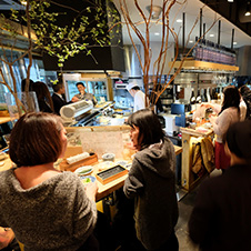 スタイリッシュな空間と、天ぷら店とは思えないクレンリネスの高さも人気の秘訣。写真の恵比寿店は白木のカウンターを配したデザインで、カウンターの高さは女性に合わせて105cmとやや低めに設定している。そうした工夫も相まって、来店客の男女比は3.5対6.5と女性客の獲得に成功。なお、アルコールの売上げ比率は40%を確保している。