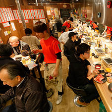 リーズナブルに焼肉が楽しめる“焼肉酒場”として人気を博している静岡・浜松の「焼肉ホルモン酒場 1129」。2018年10月にオープンした浜松有楽街店(21坪40席)は、客単価2800円で月商580万円を売り上げている。フードの主軸は焼肉32品で、単品は65g380円、盛合せは150g480円と580円の2プライスで展開。小ポーション・低価格の商品設計が、酒場的なカジュアルさを訴求するポイントの一つだ。なお、目玉商品の和牛メニューは原価率50%以上としつつ、低原価の豚ホルモンなどを上手に組み込んでトータルの原価率を33%のバランスに落とし込んでいる。カジュアルさを打ち出すもう一つの仕掛けが、60分500円で実施しているレモンサワー4種類の飲み放題。注目したいのはその売り方で、注文後にレモン半個を入れたジョッキと氷がお客に届き、客席に設置されたサーバーからお客がみずからそそぐスタイルを採用している。カウンターには2人に1基、テーブルには1卓に1基の卓上サーバーを設置し、イラストを使ったユニークなサーバーの取扱説明書も用意。レモンサワーはアルコール売上げの6割を占めているが、とくに若い女性に好評で、客層の拡大にも寄与している。