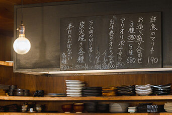 地下1階にあり、穴場感満載のお店に入ってみると、実家に帰ってきたかのような居心地の良さが印象的。カウンター正面にかけられたメニューを見てみると、「鮮魚のマリネ(190円)」「お造り盛り合わせ 3種(380円)」……と、あまりの安さに思わず二度見してしまいます。