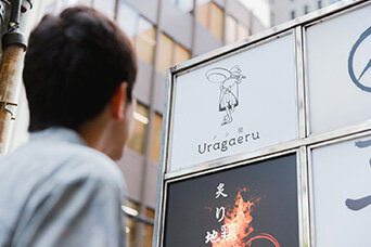 カエルの後ろ姿が描かれた「メシ屋 Uragaeru」。続いて訪ねたのは、淀屋橋駅と本町駅の中間あたりにある「メシ屋 Uragaeru」。オフィス街、しかもビルの中に店舗があるため、大人の隠れ家のような雰囲気が漂う創作料理のお店です。徒歩1分ほどの場所にイタリアンを提供する姉妹店「イタ屋 Amagaeru」もあり、2軒目で訪れるお客さんも多いのだとか。