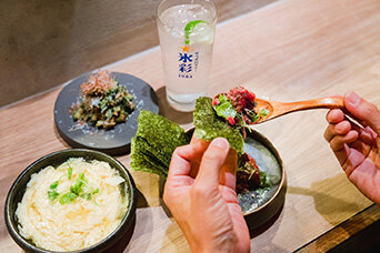 続く「海苔で巻いて食べる馬肉のなめろう」は、想像以上の美味しさ。ひと口頬張ると、パリッとした海苔の香りの中から、馬肉のとろけるような食感とほのかな甘みが現れます。さっぱりとした「氷彩」レモンサワーと合わせたら、これがまた美味いのなんの。