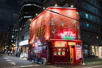 日中はサラリーマンが行き交うビジネス街ですが、夜になると飲み屋の風情が顔を覗かせてきます。真っ赤な外観がひときわ目を引く「アチャコ本店」。その名前は、かつて人気を博した漫才師・花菱アチャコに由来し、創業から73年、地元で愛され続ける老舗です。