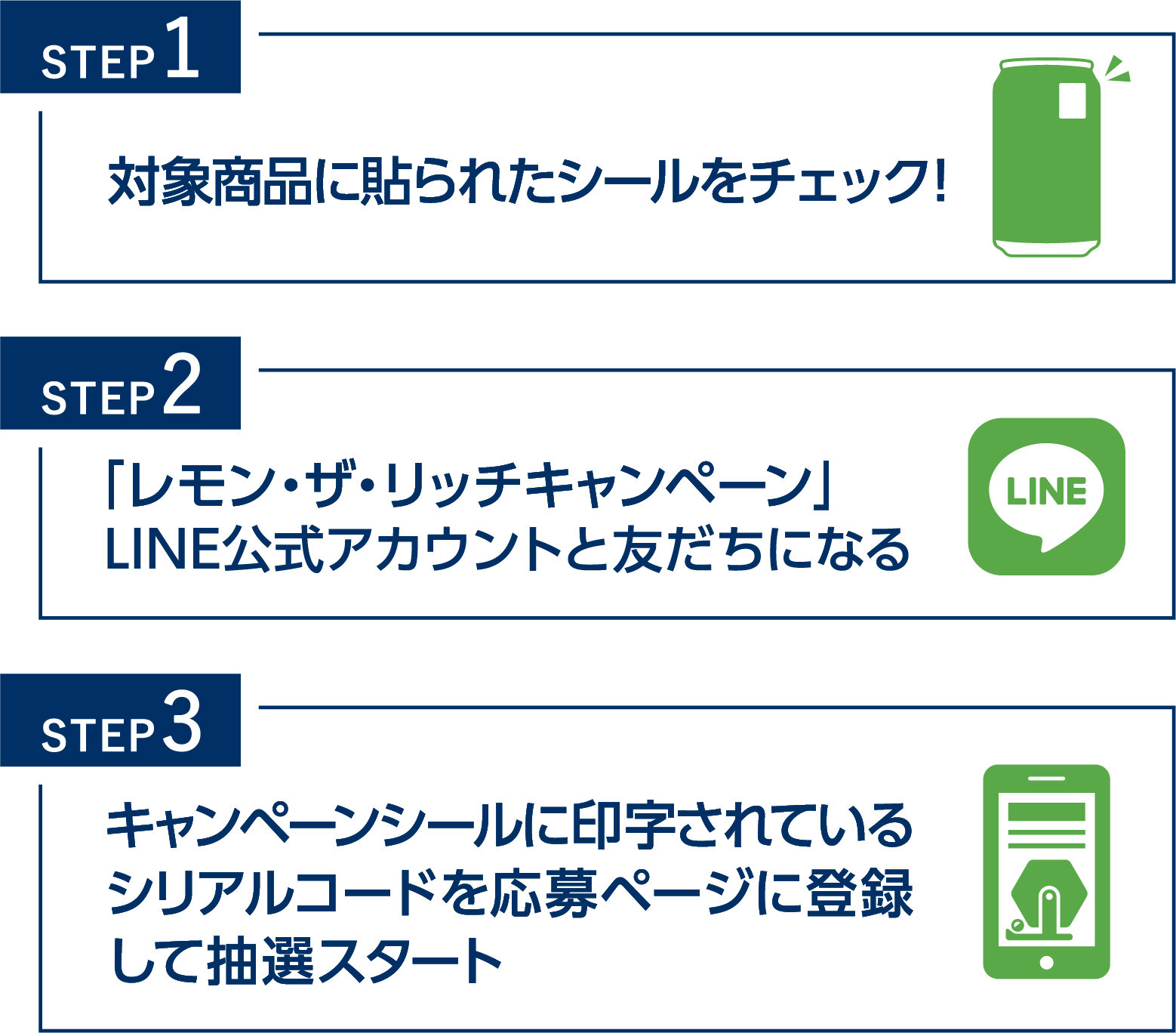 - キャンペーンサイトにアクセスし、応募規約に同意の上、「レモン・ザ・リッチキャンペーン」LINE公式アカウントを友だち追加してください。トーク画面下部のメニュー「応募はこちらから!」より応募フォームにアクセスして、対象商品をお買い上げいただきキャンペーンシールに印字されているシリアルコード、必要事項を入力のうえご応募ください。