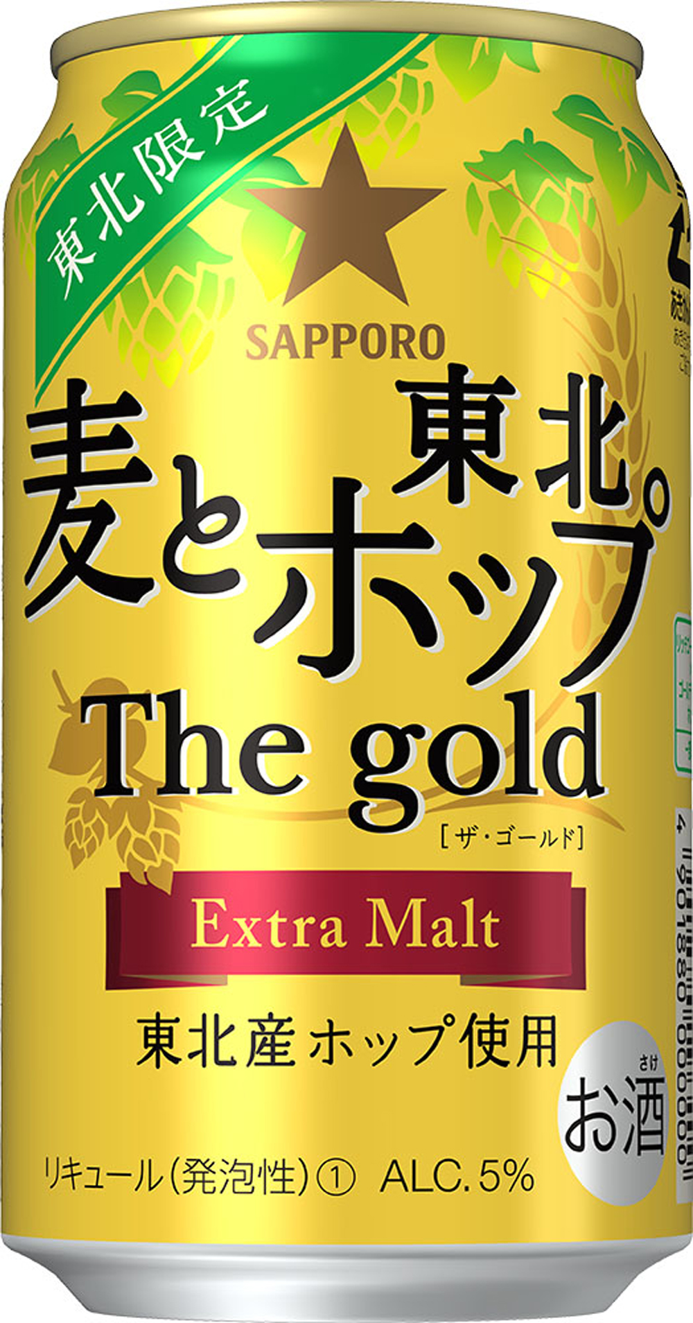 | 中味特長 | 「サッポロ 麦とホップ The gold」(リッチゴールド麦芽とゴールデンアロマホップ一部使用)の特長はそのままに、原料に東北産ホップを使用することで東北だけの贅沢なコクにさらなる磨きをかけました。 |