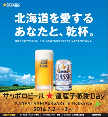 サッポログループは、1876年の創業以来、道民の方々に支えられてきた感謝の気持ちを込めて「サッポロビール★道産子感謝Day」を、2016年7月2日(土)、7月3日(日)に開催します。今年で8回目の開催となります。