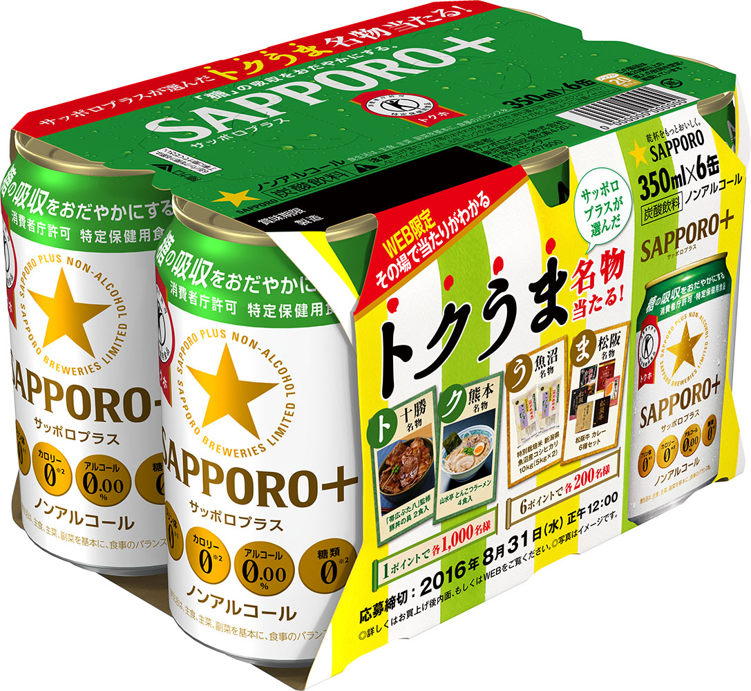 サッポロビール(株)は、ノンアルコールビールテイスト飲料SAPPORO+で「サッポロプラスが選んだトクうま名物当たる!」キャンペーンを6月27日(月)からWEB限定で実施します。