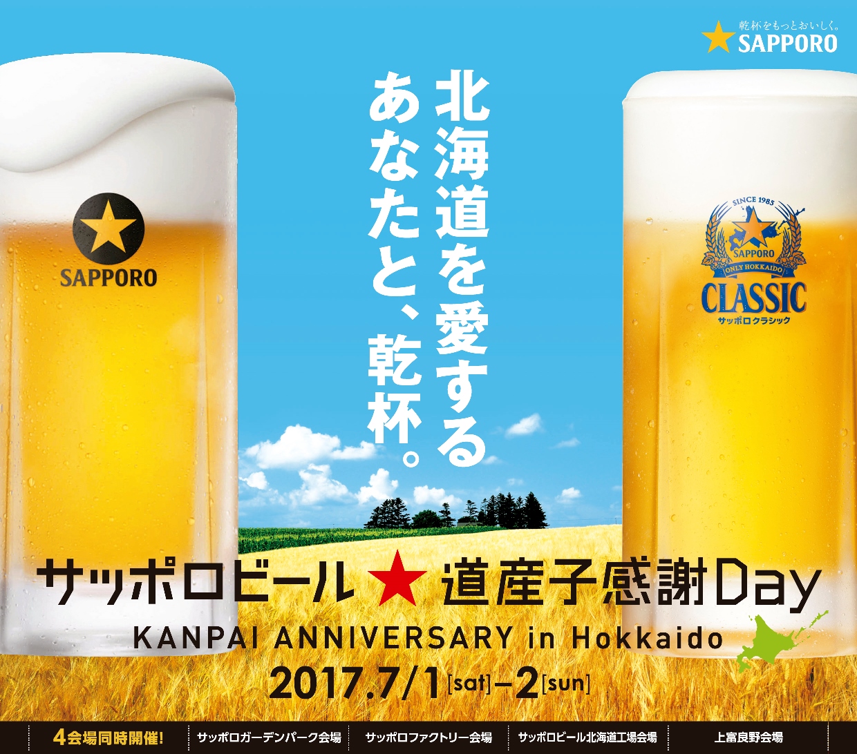 サッポロビール(株)は、1876年の創業以来、道民の方々に支えられてきた感謝の気持ちを込めて「サッポロビール★道産子感謝Day」を、2017年7月1日(土)、7月2日(日)に開催します。今年で9回目の開催となります。