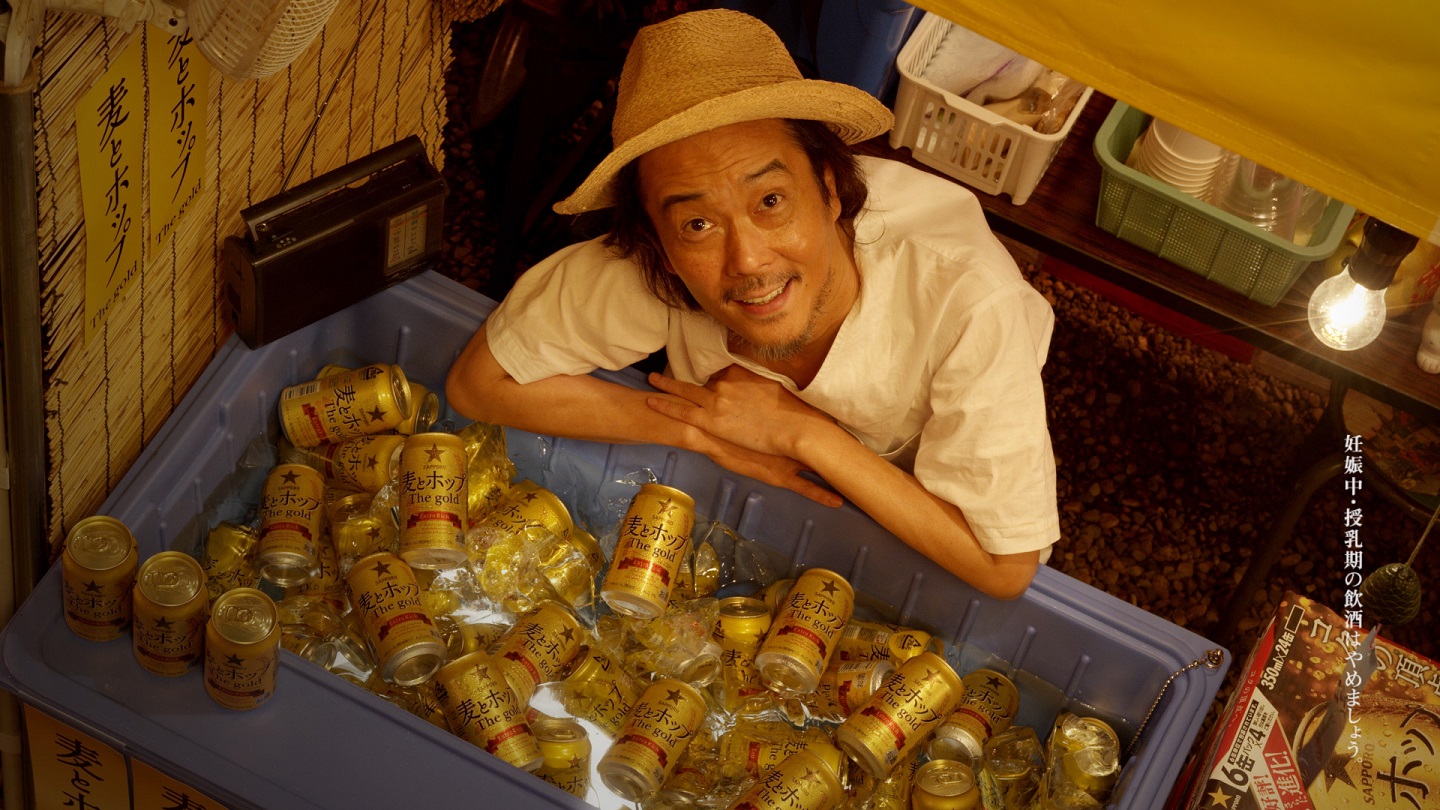 そして、ミステリアスな雰囲気を醸し出すリリーさんの今回の役どころは、何ともおいしそうに冷やされた「麦とホップThe gold」を売っている「麦とホップ The gold屋さん」。岡田さんの飲む「麦とホップ The gold」も、リリーさんのお店で買ったのか?