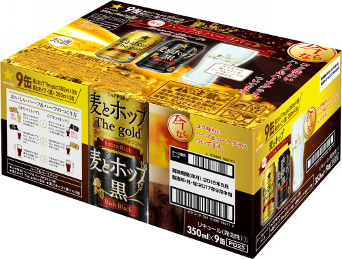 この商品は、「麦とホップ The gold」6缶と「麦とホップ<黒>」3缶に、麦とホップオリジナルの「コク味わいハーフ&ハーフグラス」1個が付いたスペシャルセットです。オリジナルグラスには、ハーフ&ハーフをつくるときの目安として、キラキラ輝く金色の星のラインを配しています。