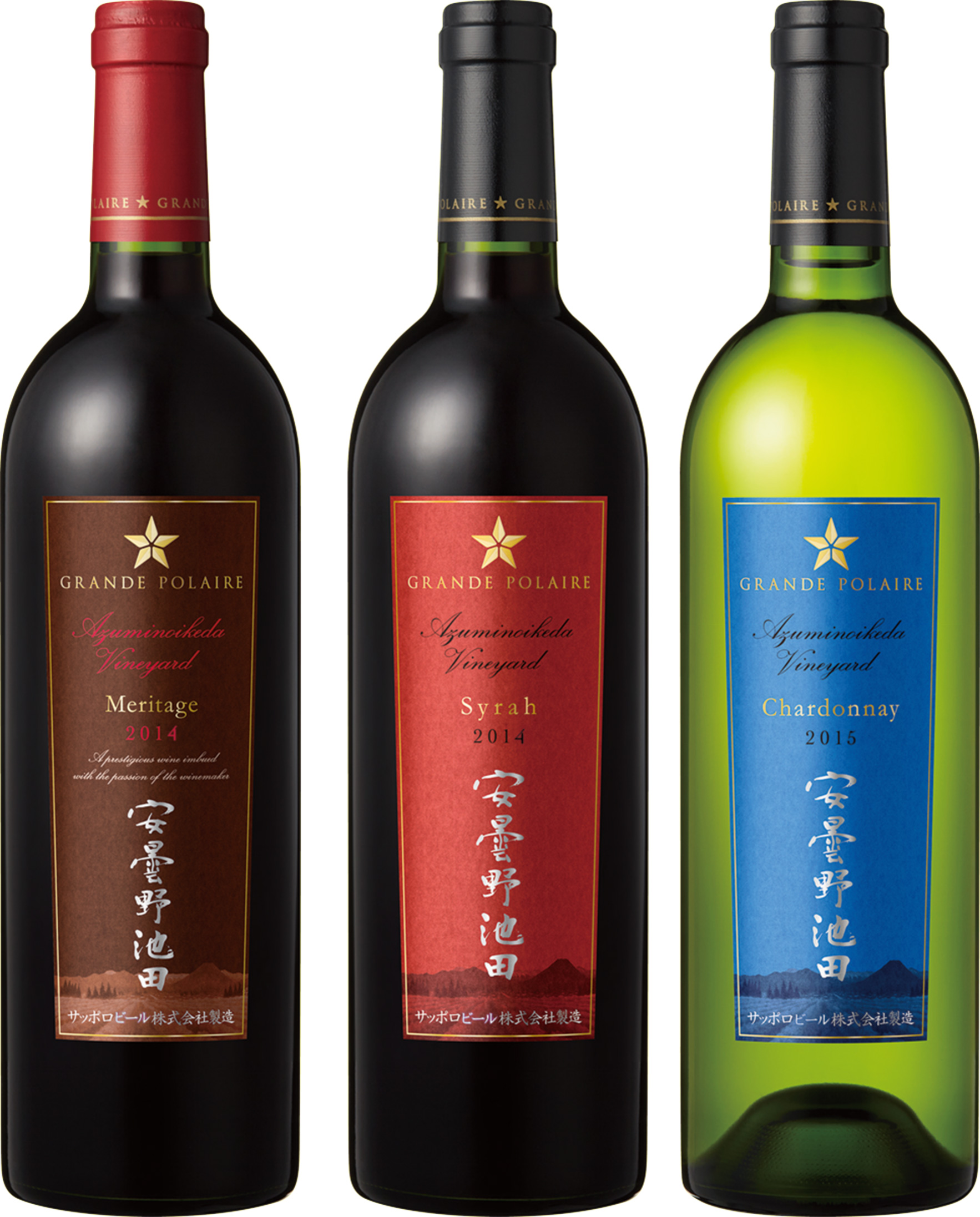 サッポロビール(株)は、「グランポレール 安曇野池田ヴィンヤード」シリーズから「メリタージュ2014」「シラー2014」「シャルドネ2015」の3アイテムを、9月5日より全国で新発売します。