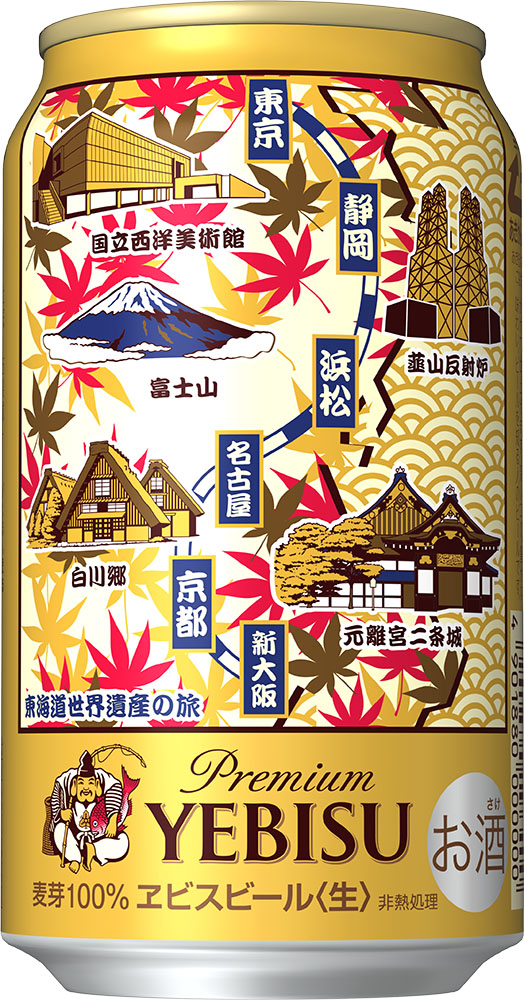 この商品は、昨年及び本年5月に発売し好評を博したことから、今回第4弾を発売するものです。デザインには国立西洋美術館、富士山、白川郷など、誰もが一度は訪れてみたいと思う東海道新幹線の各地域の世界遺産と、秋を感じさせる紅葉の絵柄をあしらっており、東海道新幹線をご利用される方や鉄道ファンの方をはじめ、プレミアムビール好きのお客様にお選びいただきたいと思います。