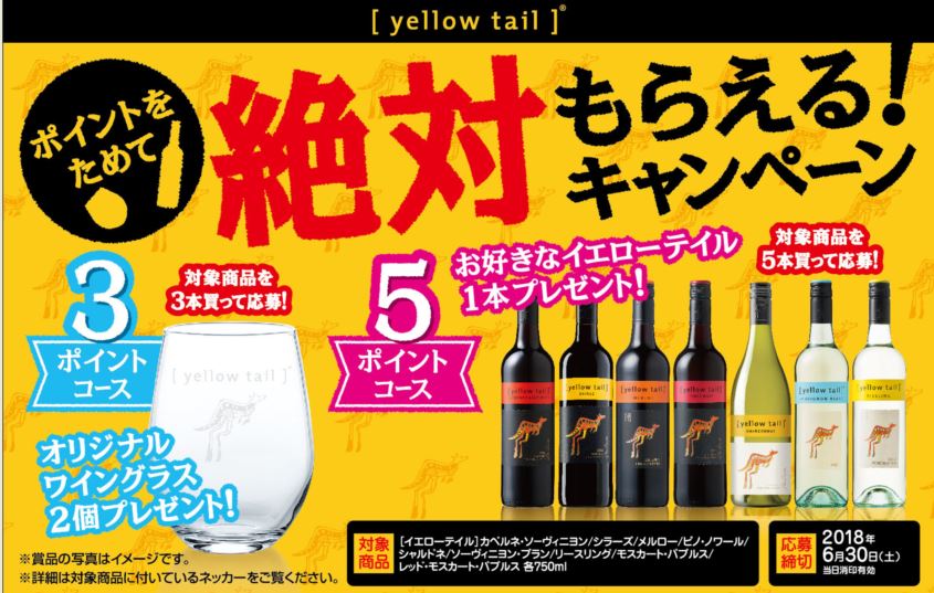 | 内容 | ・対象商品のネッカーに記載されたポイントを集めて応募すると、もれなく景品がもらえるマイレージ型キャンペーン。 ・3ポイントコース、5ポイントコースを設定し各コースで以下の景品を進呈。 3ポイントコース:[イエローテイル]オリジナルタンブラー2個 5ポイントコース:お好きな[イエローテイル]1本 |
