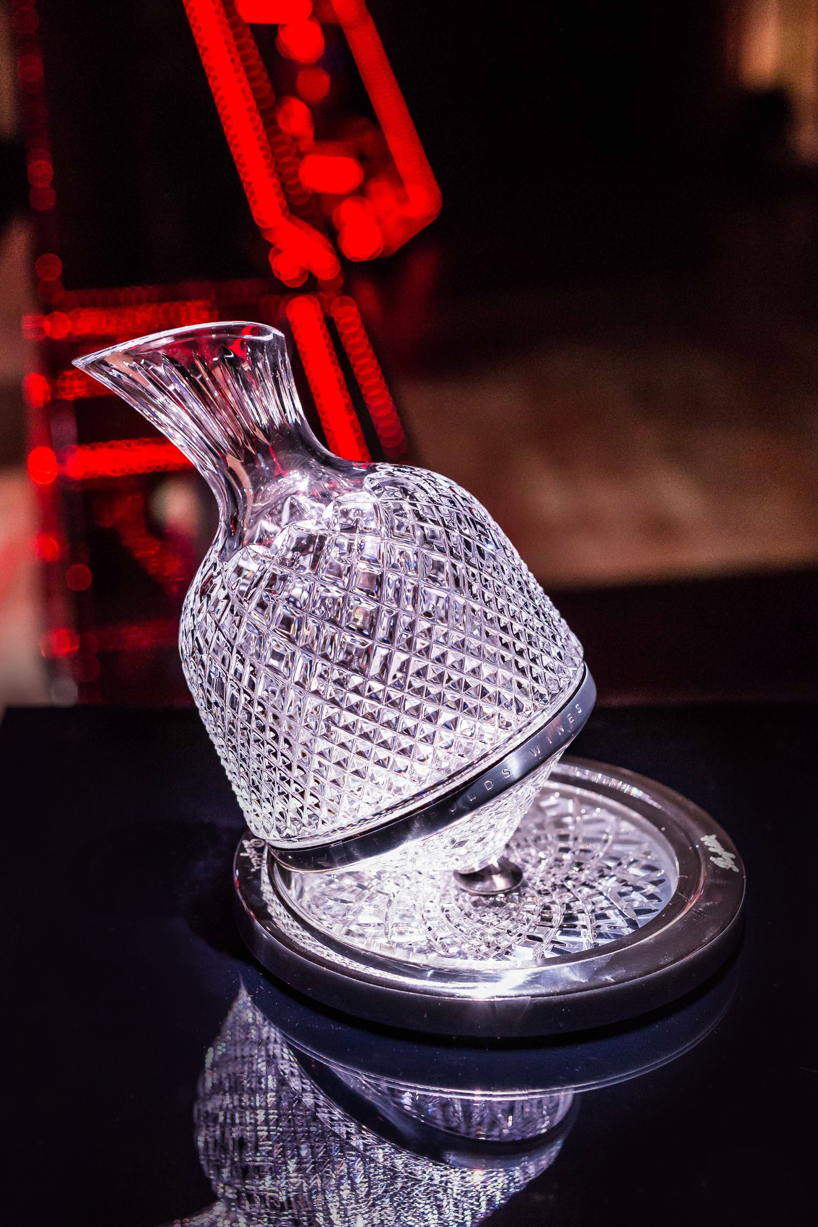 | パッケージ | グランジ2012年及びサン・ルイのデャンタ-がセットとなったギフトパック仕様。 デキャンタ―は手製で、サン・ルイが名誉をかけてこだわりぬいたクリスタルの逸品。このデャンタ-にはクリスタルとステンレスを組み合わせたキャディーとセットになっており、デャンタ-の底のポイントを支点にして、上品に回りながらワインのアエレーションを進める仕掛けが施されています。 |