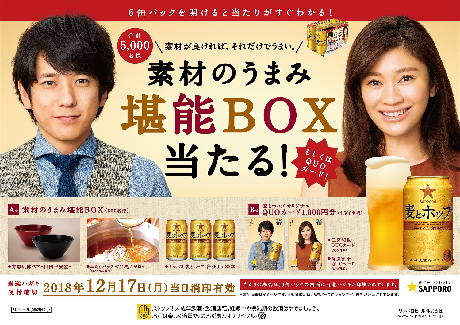 | 内容 | ・対象商品の6缶パック内面に印字されている「当たり」マーク付きハガキに必要事項を記入し、郵送にてお申し込みいただきます。(「はずれ」のときは、記載なし。) ・合計5‚000名様に賞品が当たります。 <賞品詳細> 当たりの場合、以下の2賞品いずれかが印字されています。 ① 素材のうまみ堪能BOX 500名様 ・だし処「こがね」だしパック×2 ・山田平安堂 寿恵広鉢ペア ・麦とホップ缶350ml×3本 ② 麦とホップオリジナルQUOカード500円×2枚 4‚500名様 二宮さん・篠原さんのオリジナルQUOカード各500円分の2枚セット |