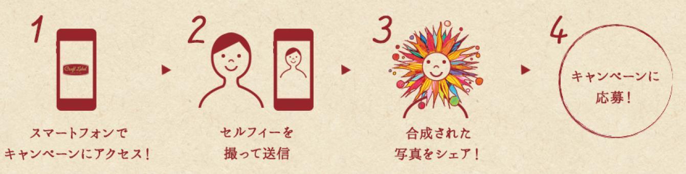 スマートフォンでキャンペーン応募サイトにアクセスいただき、ご自分の 顔を撮影いただくと、クラフトラベルのブランドロゴ「太陽」との合成画 像が作成されますので、画像をSNSでシェアしてください。その後キャンペーンサイトから応募ください。