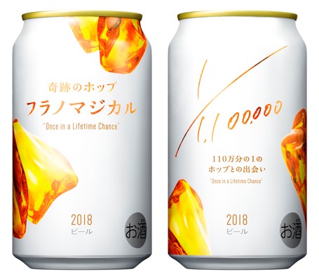 商品としては、2017年に世界中で収穫されたホップ約1億1千万kg(注2)のうち、北海道上富良野町(以降:上富良野町)でごく少量の約100㎏(注3)しか収穫できないサッポロビール(株)が同町で独自に開発した"ソラチエース(注4)"と"フラノマジカル(注5)"の2品種のホップを使用して特別醸造し、まさに「110万分の1」の確率のホップとの出逢いをお楽しみいただきます。
