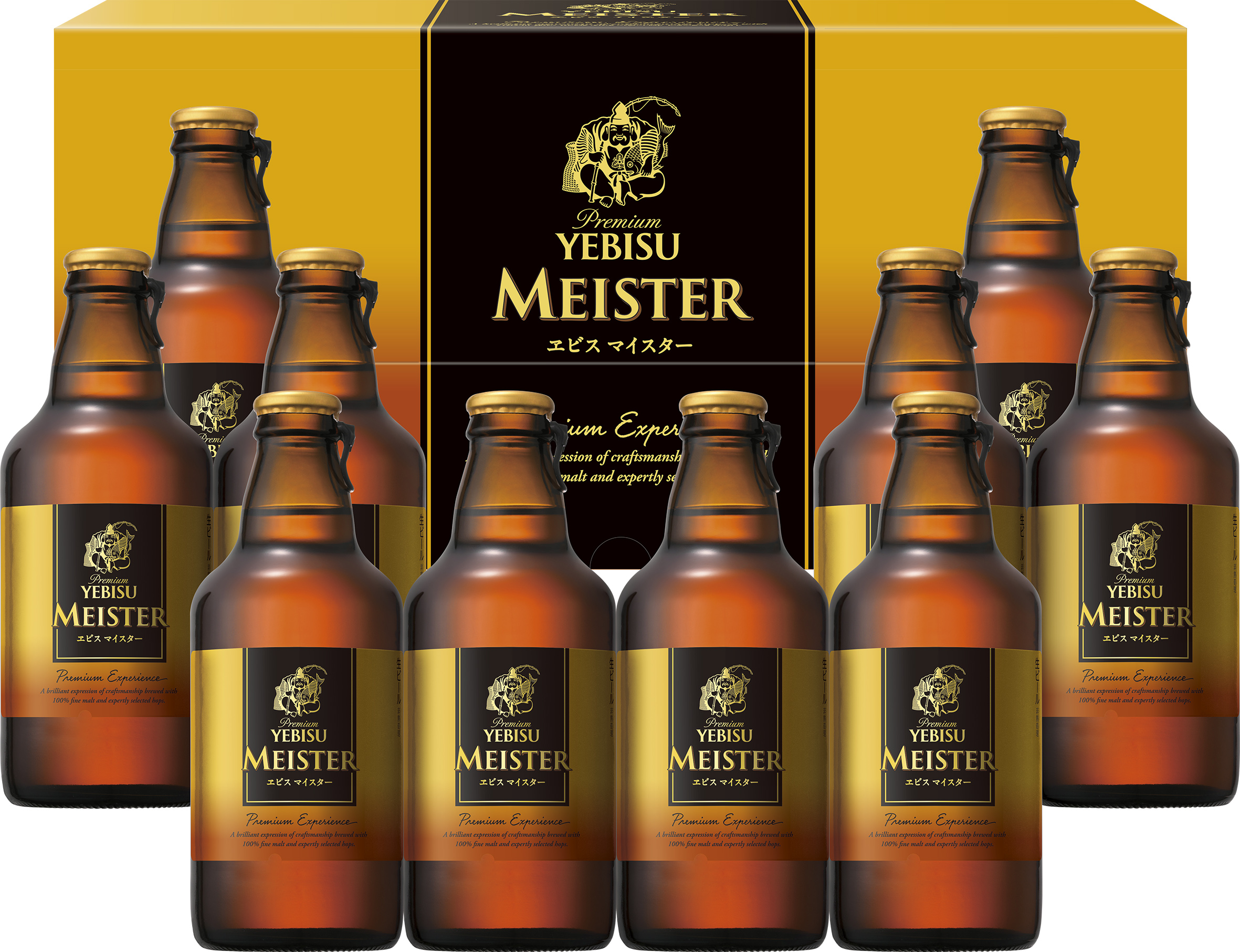 ヱビスの最高峰を目指して、匠が結集し造り上げた「ヱビス マイスター」を高級感のあるびんに詰めた、ギフト専用商品のセット。