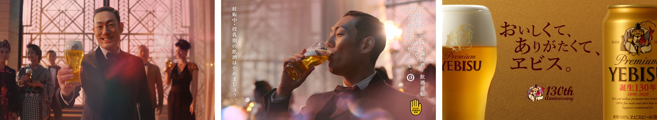 誕生130年を迎えた2020年のCMは、中村勘九郎さんがパーティー会場で仲間たちとヱビスを楽しむ姿が描かれ、華やかなCMになっています。撮影中は勘九郎さんが共演者の緊張をほぐすように、気さくに明るく話しかけている姿が印象的でした。